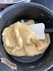- Versez ensuite en une fois la totalité de la farine, mélangez avec la maryse pour réaliser votre panade. Surtout ne pas arrêter de mélanger pour avoir une pâte bien homogène, au risque de voir apparaitre des grumeaux qui vont être très très difficile à enlever. Lorsque la panade est formée, voir la photo ci dessous :