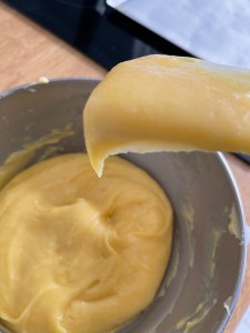 - Il faut maintenant refroidir la pâte, continuez de la mélanger, pour avoir une baisse de température homogène. Ceci pour éviter de faire coaguler les oeufs au contact d’une pâte trop chaude.