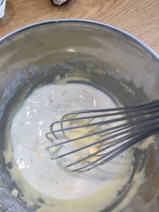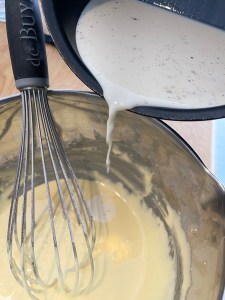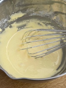 Tu vas détendre ce mélange avec la moitié du lait, tu mélanges doucement au fouet en évitant de faire mousser.