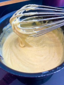 Et tu verses ce mélange dans la casserole avec le reste de lait, tu mets sur feux doux, et tu remues au fouet sans t’arrêter, oui oui j’ai dis sans s’arrêter et je surveille attention!!!! Et tu vas fouettez quelques minutes avant de voir le mélange s’épaississe, et la tu stoppes.