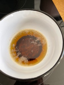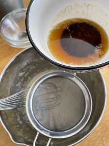 - Ajoutez le beurre noisette, j’ai utilisé un chinois pour ne pas avoir d’impuretés dans le mélange. Bien mélanger.