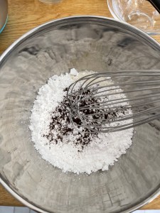 - Dans un saladier, mélangez la farine, le sucre glace, la noix de coco, la vanille et la pincée de sel.