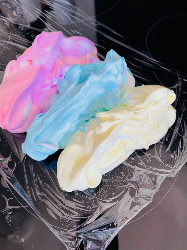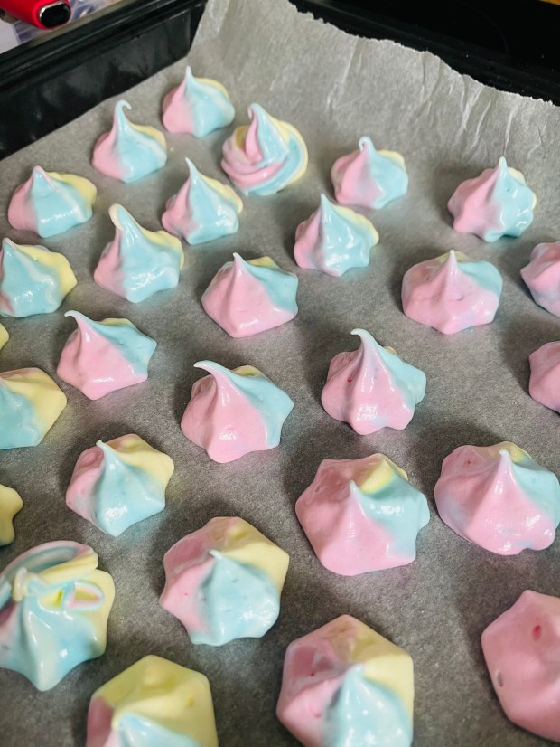 - Divisez vos blancs dans 3 bols. Mettez le colorant désiré puis remuer délicatement avec une maryse sans casser les blancs.