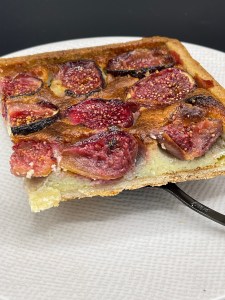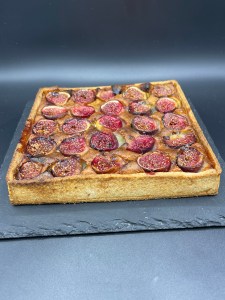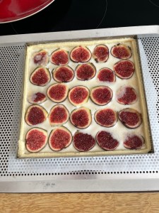 - Versez le mélange sur le fond de tarte, et garnir avec les figues coupées en deux, en les enfonçant dans la crème. (côté coupé au dessus)