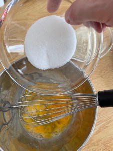 - Battre les oeufs avec le sucre en poudre jusqu’à ce que le mélange blanchisse.