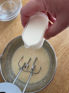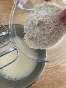 - Ajoutez ensuite la crème et la poudre d’amande, et mélangez.