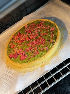 - Tu verses ensuite ta crème de pistache dans ton fond de tarte et tu y mets quelques framboises congelées et au four pour 15-20min, surveilles que la crème doit être encore bien moelleuse.