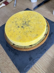 - Tu démoules le disque de crème brulée et le dépose dans le centre de ta tarte cuite.
