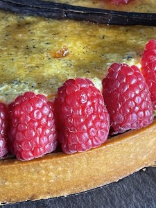 Voici une tarte plutôt originale, composée d’une pâte sucrée, une crème de pistache-framboise, et d’une crème brulée.