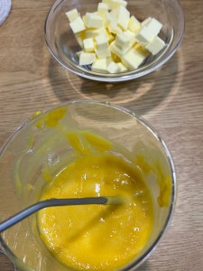 - Tu attends que le mélange descende à 40°C, et on met ensuite le beurre coupé en petit morceau dedans.