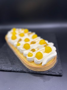 - Tu coupes ton fruit de la passion et tu mets quelques grains dessus ainsi qu’un peu de jus pour rajouter un peu de pepse à ta tarte.