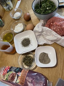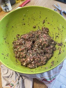 - Tu rajoutes ensuite l’oeuf, la farine, le hachis d’ail-persil-échalote et l’huile d’olive. Ajoutes le sel, le poivre, et les herbes de Provence. Tu mélanges bien.