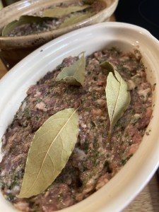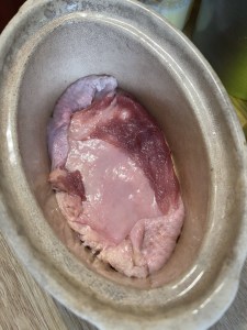 - Tu couvres ensuite avec les moitié coupés du magret dans chaque terrine et tu recouvres avec le reste de farce en tassant bien.